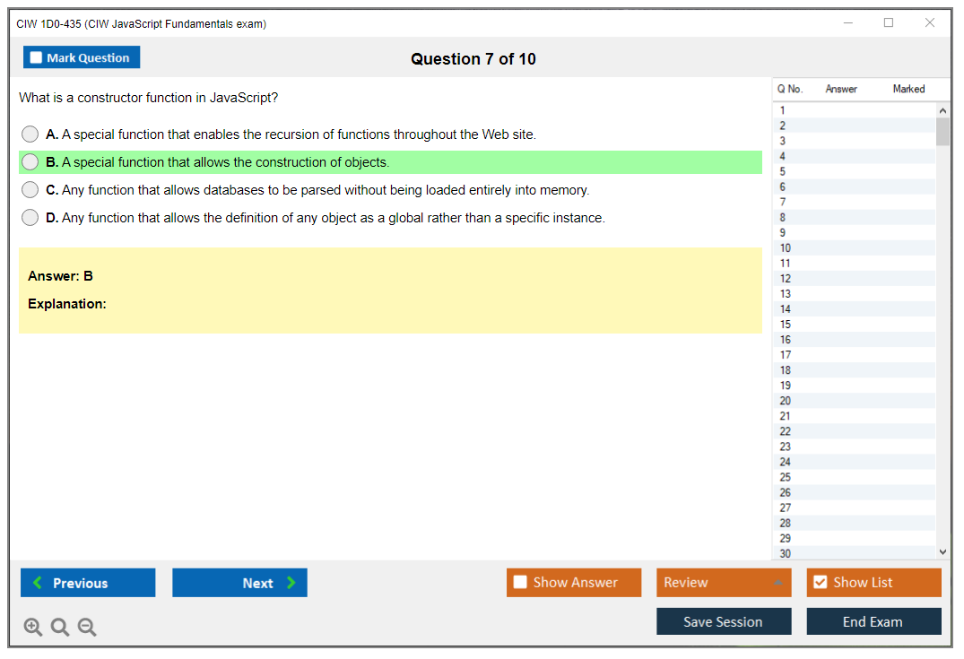 The CIW 1D0-435 (CIW JavaScript Fundamentals) exam is designed to test a candidate's knowledge and skills in using JavaScript for web development. It covers topics such as JavaScript syntax, control structures, functions, events, and object-oriented programming concepts.