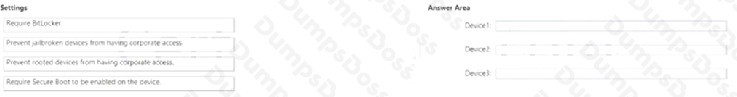 Which compliance policy setting should you configure for each device? To answer, drag the appropriate settings to the correct devices. Each setting may be used once, more than once, or not at all. You may need to drag the split bar between panes or scroll to view content.