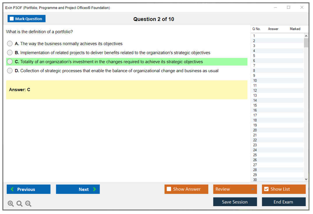 The Exin P3OF (Portfolio, Programme and Project Offices® Foundation) exam is designed to test the knowledge and understanding of the principles and practices of Portfolio, Programme, and Project Offices. It helps professionals understand how to support delivery mechanisms for change within an organization.